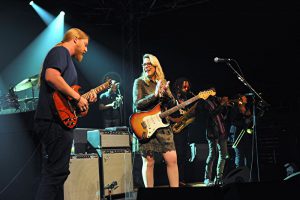 Der Sohn des Drummers der Allman Brothers, Derek Trucks und die Tochter zweier Musiker, Susan Tedeschi fanden sich nicht nur musikalisch auf derselben Wellenlänge und heirateten 2001. Wie passend, dass auch ihre stilistische Schnittmenge zwischen fantasievollem Memphis Soul, Electric Rhythm & Blues, Country, Rock und klassischem Songwriting von der Ost- bis zur Westküste liegt. Dass diese Formation inzwischen als eine der virtuosesten Gruppen in der Nachfolge der Allman Brothers gilt, konnten sie in der gut gefüllten großen Mehrzweckhalle in Roth überzeugend unter Beweis stellen. Die Soli von Derek auf der Gibson-SG-Fadet-T-Gitarre waren fürs Publikum wie für seine Gattin Susan zum Zungeschnalzen, die ihrerseits auf der Fender-Stratocaster glänzte. Bereits für ihr Debütalbum „Revelator“ erhielten sie zusammen einen Grammy und auch ihr im eigenen „Swamp Raga“-Studio in Florida aufgenommenes 2016er Album „Let Me Get By“ fesselte live in Roth die Blues-Fans. Rechtzeitig zur Tornee erschien nun das Doppel-CD/DVD-Album „Live from the Fox Oakland“ mit dem intensiven Cohen-Cover „Bird On The Wire“ zum Nachhören und Genießen mit Susan Trucks kraftvoller Stimme zwischen Janis Joplin und Bonnie Raitt und Derek Trucks Bottleneck-Slide-Guitar mit viel Southern Feeling – „That Did It!“. Zugaben weiterer Bands werden bei den Rother Bluestagen bis zum 2.4.2017 geliefert.