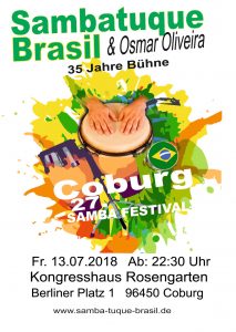 Sambatuque Brasil & Osmar Oliveira (einst Manager von Fußball-Profi Cacau) ist die populärste Samba-Band außerhalb Brasiliens und wohl auch die erfolgreichste. Am 13.7.18 feieren in Coburg Osmar und Co ihr 35-jähriges Bühnen-Jubiläum. 2018 werden sie gleichzeitig ihr 22-jähriges Coburg-Auftritts-Jubiläum begehen. Sie spielen am Freitag, 13.7. ab 22.30 Uhr im Kongresshaus Rosengarten