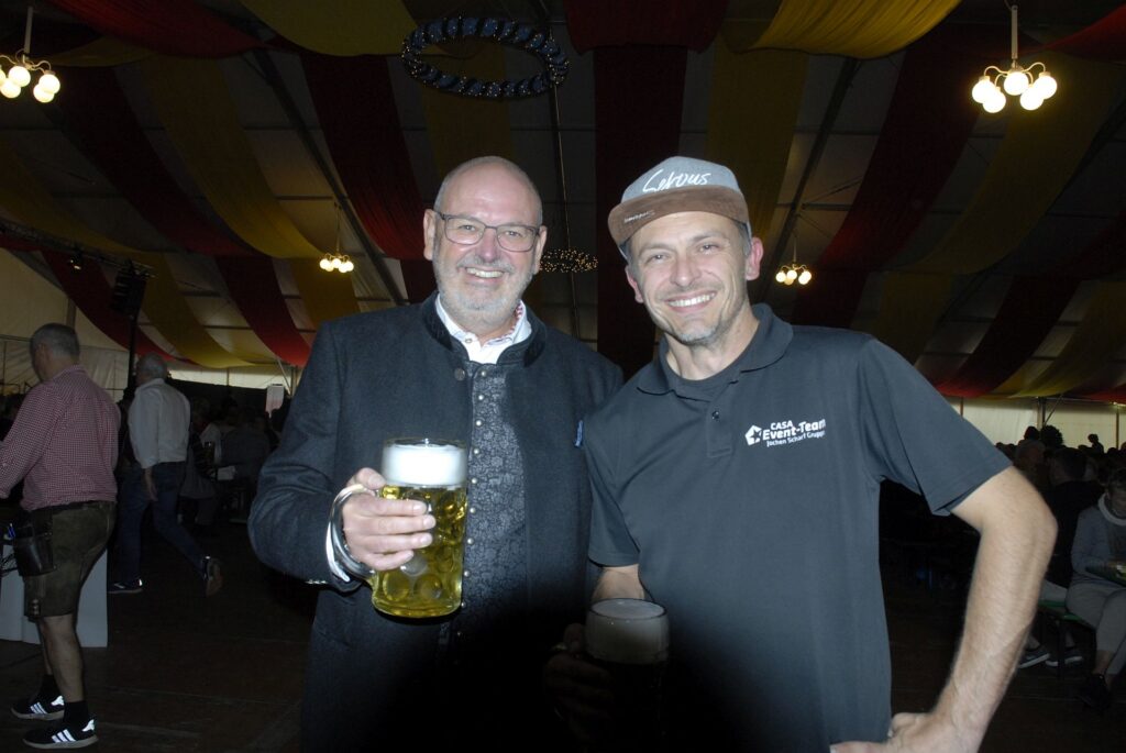 Welch ein, Prachttag für die CSU am 8.8 2023 und mittendrin zu Gast und Ministerpräsident Dr.Markus Söder im Limbacher Festzelt in Schwabach. Ein Mann der Impulse setzte,rund 2000 Gäste, Fans, Getreue in Feierstimmung. Inmitten der der CSU- ein Roter, Schwabachs OB Peter Reiß Ehrengast und fleißiger Zuhörer bei den Söderschen Ausführungen, die rund eineinhalb Stunden dauerten. Die Familie Reißreeiß doppelt vertreten: vor dem Festzelt siegte und dominierte Stadträtin und Schwester als Bezirkstag-Kandidatin auf dem Plakat vor Söder, im Zelte genoss Hanno Dietrich im Stehen Söder, spendete Beifall-Beifall wie zwischendrin Peter ReißDer Oberbürgermeister mit Sitzfleisch und Durchhaltvrmögen:“Ich bedanke mich für die Einladung und ich bin auch gerne gekommen, hoffe, dass von den versprochenen Millionen für Franken auch in -Schwabach ankommen, wenn das so kommt, bin ich sehr glücklich. Söders Rede war launig, inhaltlich gab es auch Passagen, wo ich anderer Meinung bin, aber die Launigkeit kann man ihm nicht abstreiten. Beklatscht habe ich den TV 48-Musikzug und die Themen zum bayerischen Pflegegeld, ein große Soziallreistung, das ich grundsätzlich für richtig halte. wenn ich das für richtig halte, bei anderen Passagen da hätte ich nicht grklatscht, aber man kann da ja auch anderer Meinung sein, Aber es war ein Abend der stimmungsvoll war, emotionsvoll“Söder:“Mit mir wir es keine Grünen in der Staatregierung geben“ Mehr Politik im Lokalteil des Schwabacher Tagblatts nur soviel, Karl Freller als Landtagsvizepräsident über Söder: „Er ist ein echter Kämpfer für die Demokratie, der für seinen Stimmkreis brennt.“ Freller weiter: „Er ist der Starke gegen den Mist aus Berlin.“Söder mit Kultstatus, der König von Schwabach, umlagert und umschwärmt und gefeiert von den Massen, ein guter Laune Onkel. Lob auch von Norbert Wittmann, Schwabachr Unterhalter:“Er kann halt motivieren die Einstellung passt. Im Bierzelt musst du halt anders reden, er hat einen Redefluß, der ist super,“Am Freitag hat Wittmann einen Polit-Auftrtt bei „Benny‘ in der Bachgasse. Festwirt und Autohändler Jochen Scharf: „Das muss man dem Herrn Ministerpräsidenten wirklich lassen, er kann ein Festszelt mit 2000 Besuchern n seinen Bann ziehen, für einen Gastronomen ein schöner Abend, ein Feiertag“ befand auch Scharf am Ende des Tages zufrieden. Matthias HertleinZufriedener Festwirt und Kompagnon:Jochen und Christian. Foto: Matthias Hertlein