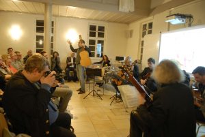 Vorjahres-Preisträger Geraldino und Saitenwirbel-Vorstand Bert Lippert im gemeinsamen Duell. Die Kulturmeter-Verleihung 2018 in der Alten Synagoge in Schwabach. Klaus Neunhoeffer überreichte Bert Lippert den Kulturmeter und den Scheck, Laudator Hans von Draminski fachsimpelte mit Stefan Grasse,  Stefan Graßhauser las aus seinem Buch „Der Grabsänger“. Fotos: Matthias Hertlein