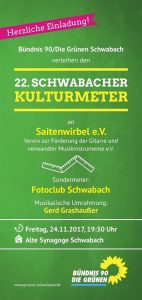 Kulturmeter-Verleihung des Bündnis90/Die Grünen am Freitag in der  Alten Synagoge. Die Auszeichnung ging heuer  an den musikalischen  Verein „Saitenwirbel“ um Bert Lippert . Der Sondermeter wanderte an den Fotoclub-Schwabach (Schwabacher Tagblatt, Ausgabe 27. November 2017). Vorjahres-Preisträger Geraldino sorgte für den wie immer amüsanten Unterhaltungsteil.