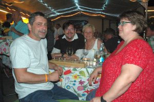 Theatrum Mundi-Ensemble beim Feiern im Lions Club-Zelt: Stefan Gruber (mit Gattin) und Kalle Odörfer , daneben Schwabanesen-Ikone Heidi Tratz, die auch mit schweizerischen Faschings-Gästen unterwegs war. Foto: Hertlein