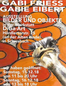 Neben den Weihnachtsmarkt, Teil 2, rund um den Marktplatz, gibt  es am Sonntag auch noch von 13 bis 18 Uhr eine Doppelausstellung der beiden Künstlerinnen Gabie Eibert und Gabi Fries (Motto:“Bilder und Objekte“) in der Werkstatt DiGa-Art, Hördlertorstraße 25 (gegenüber dem Spielplatz), zu bewundern. Auch Anregungen für ein originelles Weihnachtsgeschenk sind durchaus vorhanden. Stars der Ausstellung am Samstag war die Serie über die Straßenvogel-Gemälde von Gabi Fries.