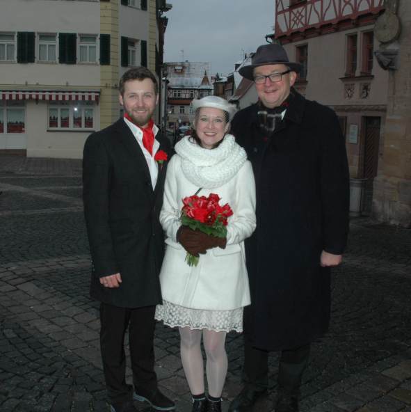 hetzehochzeit6-2016- hertlein hetzehochzeit1-2016 hetztehochzeit8-2016 hetztehochzeit9-2016Standesamtliche Hochzeit im Hause Hartmut Hetzelein (Verkehrsverein, AWO) und Uschi Müller-Hetzelein (Galanteriewaren) am 17.Januar 2016 im Goldenen Saal des Schwabcher Rathauses: Katharina Hetzelein und Christian Wolf heirateten. Als Überraschung trat Uschi Kaiser-Biburger auf, die Stadtheimatpflegerin  lud das Brautpaar und die Feier-Gäste zu einer kleinen Stadtführung ein. Prima Idee.