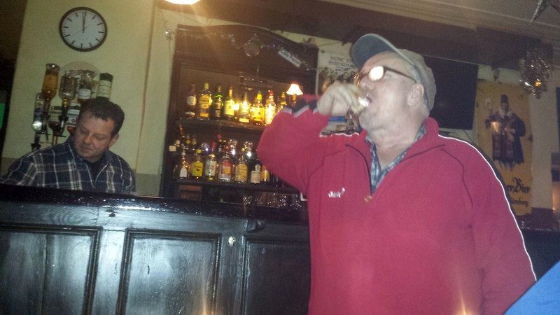 Bekam am 2. Advent im MARKGRAF seinen Nikolaus-Schnaps, einen Oouzo.sonntags-Stammgast Jürgen. Foto: Matthias Hertlein. Hinter der Theke Jürgen Nummer 2.einen Ouzo